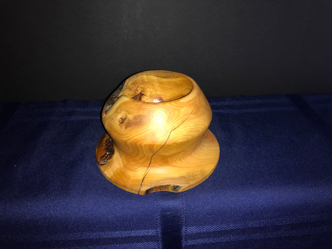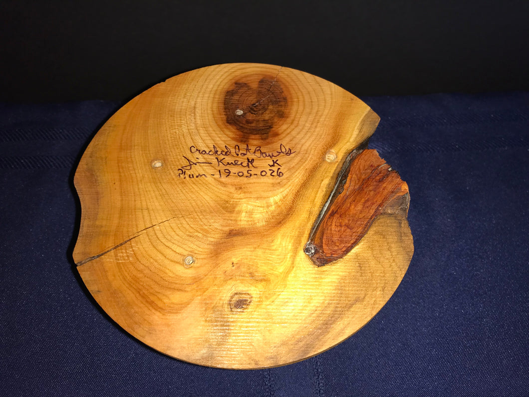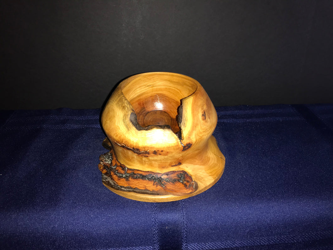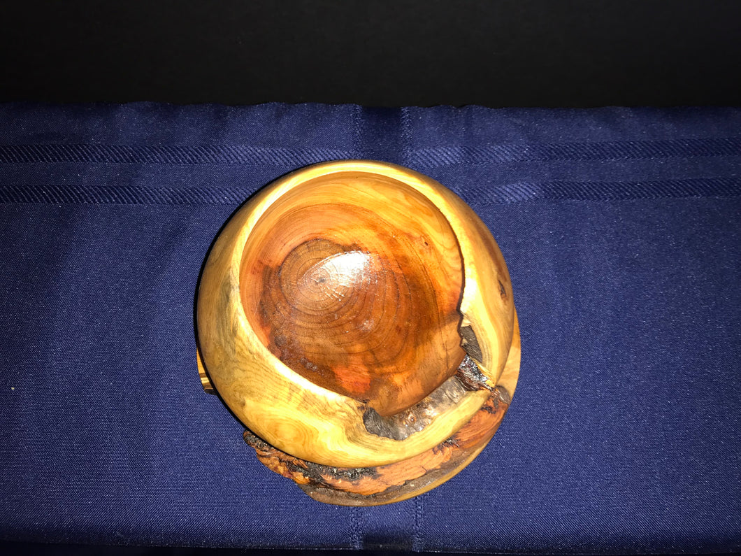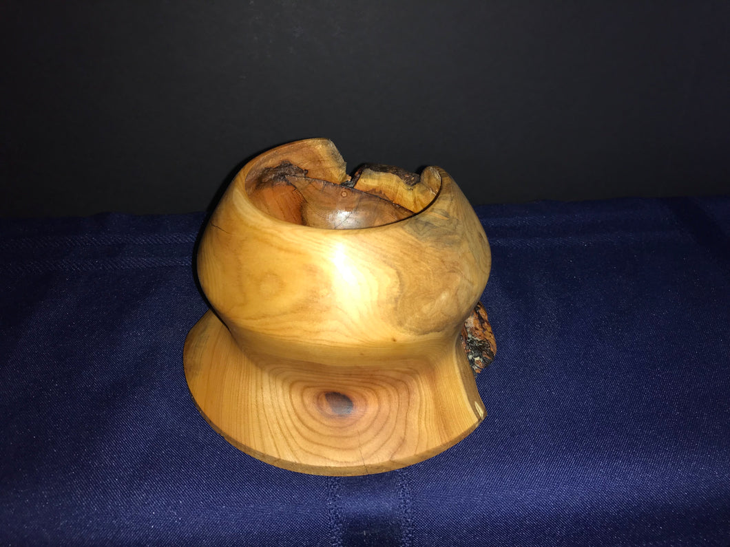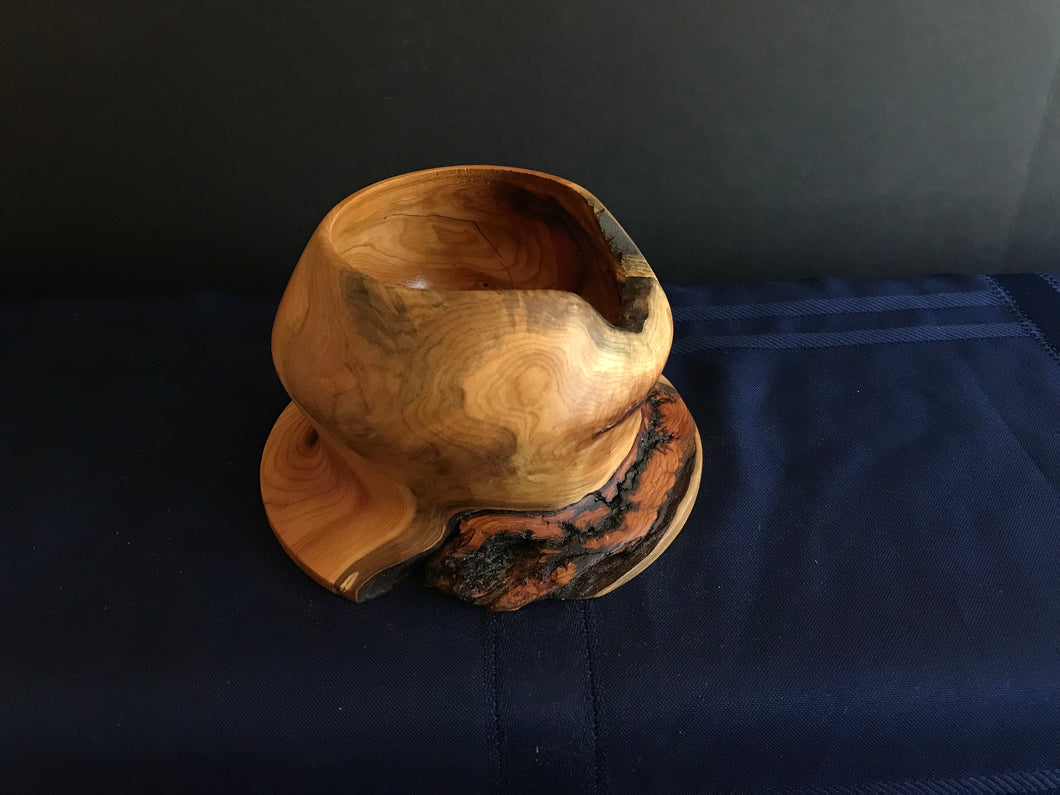 So this form has a part of the log with a bit of bark as the bottom - The bowl "emerges" out of the flat plane exposing differing grain and colors. It is in fact a Cracked Pot with a crack across the heartwood.